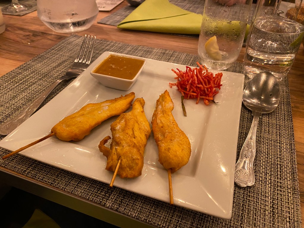 To start I had goong soh-beng-tort, which are prawns in a crispy Japanese batter, served with sweet chili sauce. My husband had chicken satay skewers, which is called gai satay.